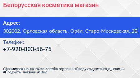 Белорусская косметика, магазин по адресу 302002, Орловская область, Орёл, Старо-Московская, 2Б в дальнейшем Организация, размещена в следующих категориях: