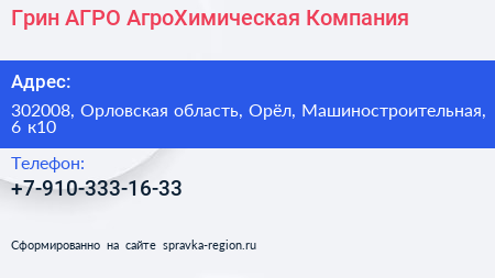 Грин АГРО, АгроХимическая Компания по адресу 302008, Орловская область, Орёл, Машиностроительная, 6 к10 в дальнейшем Организация, размещена в следующих категориях: