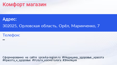 Комфорт, магазин по адресу 302025, Орловская область, Орёл, Маринченко, 7 в дальнейшем Организация, размещена в следующих категориях:
