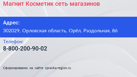 Магнит Косметик, сеть магазинов по адресу 302029, Орловская область, Орёл, Раздольная, 86 в дальнейшем Организация, размещена в следующих категориях: