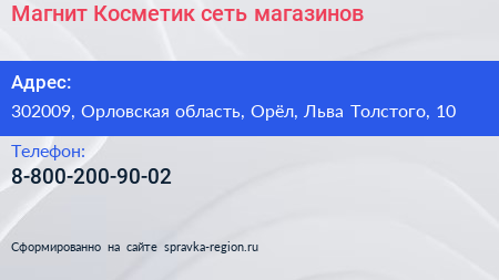Магнит Косметик, сеть магазинов по адресу 302009, Орловская область, Орёл, Льва Толстого, 10 в дальнейшем Организация, размещена в следующих категориях: