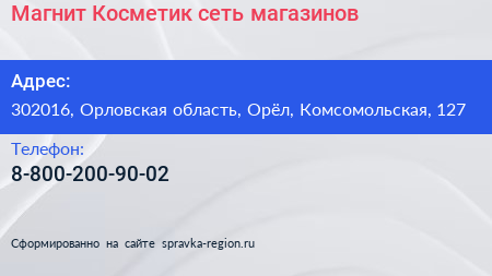 Магнит Косметик, сеть магазинов по адресу 302016, Орловская область, Орёл, Комсомольская, 127 в дальнейшем Организация, размещена в следующих категориях: