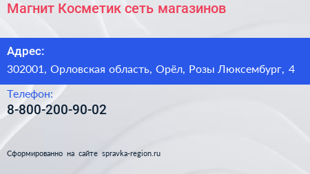 Магнит Косметик, сеть магазинов по адресу 302001, Орловская область, Орёл, Розы Люксембург, 4 в дальнейшем Организация, размещена в следующих категориях: