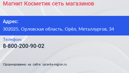 Магнит Косметик, сеть магазинов по адресу 302025, Орловская область, Орёл, Металлургов, 34 в дальнейшем Организация, размещена в следующих категориях: