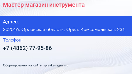 Мастер, магазин инструмента по адресу 302016, Орловская область, Орёл, Комсомольская, 231 в дальнейшем Организация, размещена в следующих категориях:
