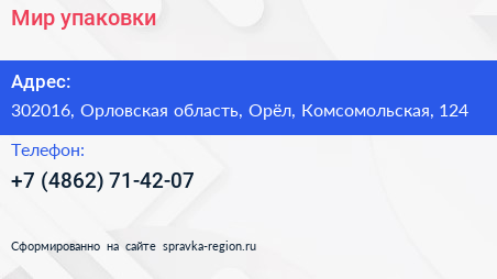 Мир упаковки по адресу 302016, Орловская область, Орёл, Комсомольская, 124 в дальнейшем Организация, размещена в следующих категориях: