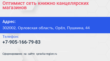 Оптимист, сеть книжно-канцелярских магазинов по адресу 302002, Орловская область, Орёл, Пушкина, 44 в дальнейшем Организация, размещена в следующих категориях: