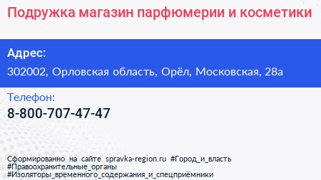 Подружка, магазин парфюмерии и косметики по адресу 302002, Орловская область, Орёл, Московская, 28а в дальнейшем Организация, размещена в следующих категориях: