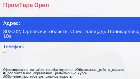 ПромТара Орел по адресу 302002, Орловская область, Орёл, площадь Поликарпова, 10а в дальнейшем Организация, размещена в следующих категориях: