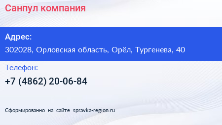 Санпул, компания по адресу 302028, Орловская область, Орёл, Тургенева, 40 в дальнейшем Организация, размещена в следующих категориях: