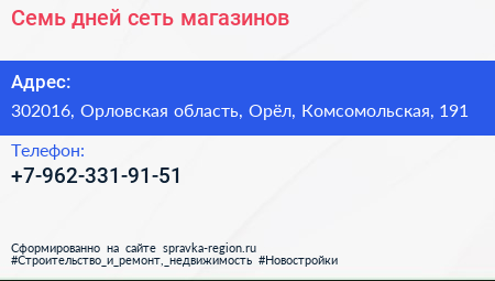 Семь дней, сеть магазинов по адресу 302016, Орловская область, Орёл, Комсомольская, 191 в дальнейшем Организация, размещена в следующих категориях: