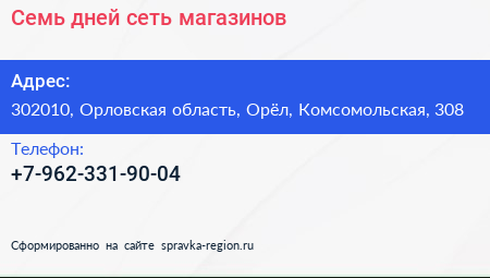 Семь дней, сеть магазинов по адресу 302010, Орловская область, Орёл, Комсомольская, 308 в дальнейшем Организация, размещена в следующих категориях: