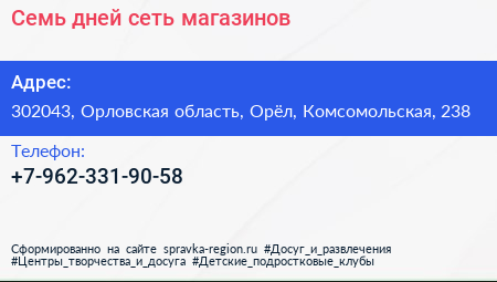 Семь дней, сеть магазинов по адресу 302043, Орловская область, Орёл, Комсомольская, 238 в дальнейшем Организация, размещена в следующих категориях: