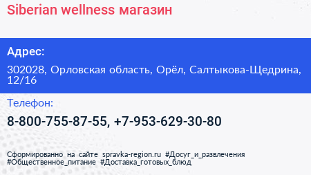 Siberian wellness, магазин по адресу 302028, Орловская область, Орёл, Салтыкова-Щедрина, 12/16 в дальнейшем Организация, размещена в следующих категориях:
