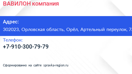ВАВИЛОН, компания по адресу 302023, Орловская область, Орёл, Артельный переулок, 7а в дальнейшем Организация, размещена в следующих категориях: