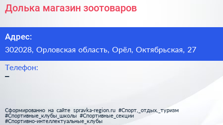 Долька, магазин зоотоваров по адресу 302028, Орловская область, Орёл, Октябрьская, 27 в дальнейшем Организация, размещена в следующих категориях: