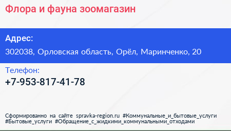 Флора и фауна, зоомагазин по адресу 302038, Орловская область, Орёл, Маринченко, 20 в дальнейшем Организация, размещена в следующих категориях: