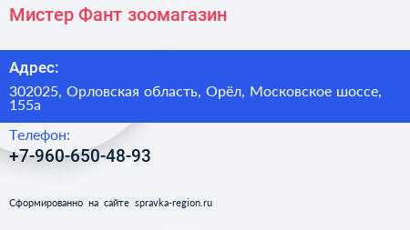 Мистер Фант, зоомагазин по адресу 302025, Орловская область, Орёл, Московское шоссе, 155а в дальнейшем Организация, размещена в следующих категориях: