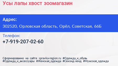 Усы лапы хвост, зоомагазин по адресу 302520, Орловская область, Орёл, Советская, 66Б в дальнейшем Организация, размещена в следующих категориях: