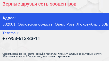 Верные друзья, сеть зооцентров по адресу 302001, Орловская область, Орёл, Розы Люксембург, 53Б в дальнейшем Организация, размещена в следующих категориях:
