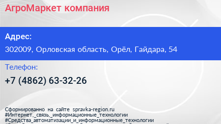 АгроМаркет, компания по адресу 302009, Орловская область, Орёл, Гайдара, 54 в дальнейшем Организация, размещена в следующих категориях: