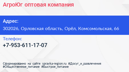 АгроЮг, оптовая компания по адресу 302026, Орловская область, Орёл, Комсомольская, 66 в дальнейшем Организация, размещена в следующих категориях: