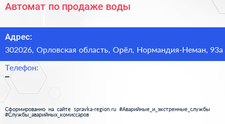 Автомат по продаже воды по адресу 302026, Орловская область, Орёл, Нормандия-Неман, 93а в дальнейшем Организация, размещена в следующих категориях: