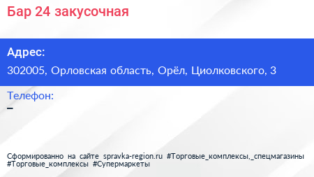 Бар 24, закусочная по адресу 302005, Орловская область, Орёл, Циолковского, 3 в дальнейшем Организация, размещена в следующих категориях: