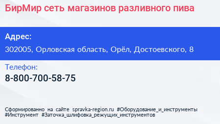 БирМир, сеть магазинов разливного пива по адресу 302005, Орловская область, Орёл, Достоевского, 8 в дальнейшем Организация, размещена в следующих категориях: