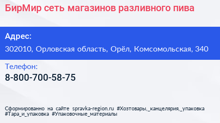 БирМир, сеть магазинов разливного пива по адресу 302010, Орловская область, Орёл, Комсомольская, 340 в дальнейшем Организация, размещена в следующих категориях:
