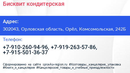 Бисквит, кондитерская по адресу 302043, Орловская область, Орёл, Комсомольская, 242Б в дальнейшем Организация, размещена в следующих категориях:
