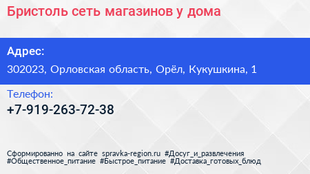 Бристоль, сеть магазинов у дома по адресу 302023, Орловская область, Орёл, Кукушкина, 1 в дальнейшем Организация, размещена в следующих категориях: