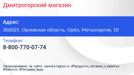 Дмитрогорский, магазин по адресу 302025, Орловская область, Орёл, Металлургов, 10 в дальнейшем Организация, размещена в следующих категориях: