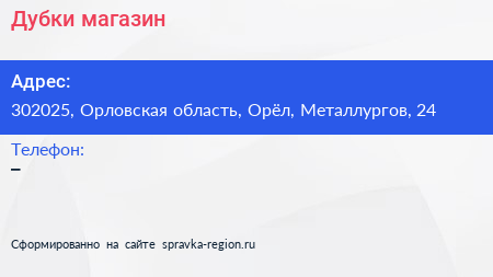 Дубки, магазин по адресу 302025, Орловская область, Орёл, Металлургов, 24 в дальнейшем Организация, размещена в следующих категориях: