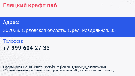 Елецкий крафт, паб по адресу 302038, Орловская область, Орёл, Раздольная, 35 в дальнейшем Организация, размещена в следующих категориях: