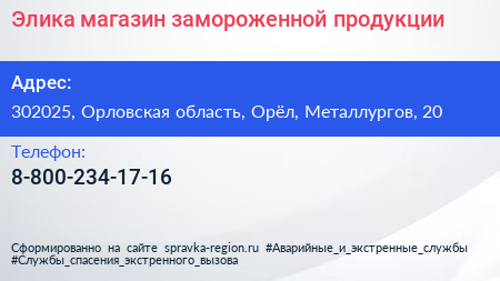 Элика, магазин замороженной продукции по адресу 302025, Орловская область, Орёл, Металлургов, 20 в дальнейшем Организация, размещена в следующих категориях: