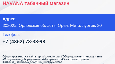 HAVANA, табачный магазин по адресу 302025, Орловская область, Орёл, Металлургов, 20 в дальнейшем Организация, размещена в следующих категориях: