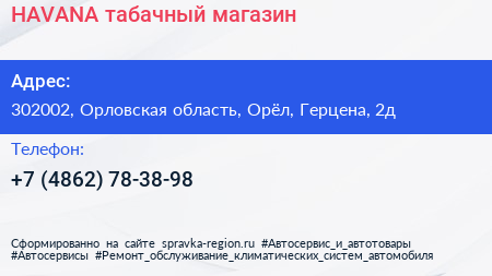 HAVANA, табачный магазин по адресу 302002, Орловская область, Орёл, Герцена, 2д в дальнейшем Организация, размещена в следующих категориях: