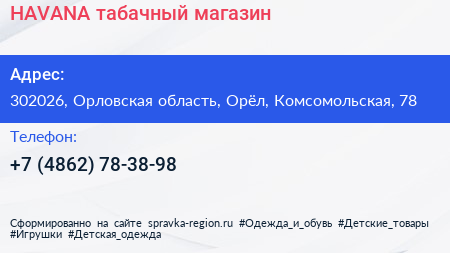 HAVANA, табачный магазин по адресу 302026, Орловская область, Орёл, Комсомольская, 78 в дальнейшем Организация, размещена в следующих категориях: