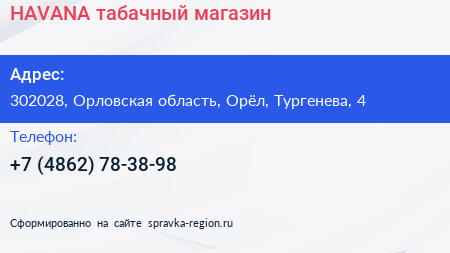 HAVANA, табачный магазин по адресу 302028, Орловская область, Орёл, Тургенева, 4 в дальнейшем Организация, размещена в следующих категориях: