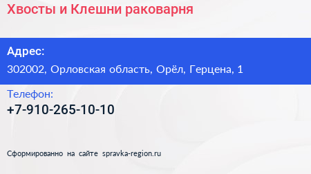 Хвосты и Клешни, раковарня по адресу 302002, Орловская область, Орёл, Герцена, 1 в дальнейшем Организация, размещена в следующих категориях: