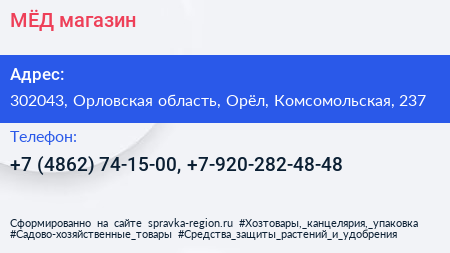 МЁД, магазин по адресу 302043, Орловская область, Орёл, Комсомольская, 237 в дальнейшем Организация, размещена в следующих категориях: