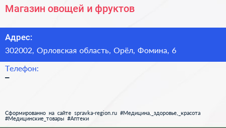 Магазин овощей и фруктов по адресу 302002, Орловская область, Орёл, Фомина, 6 в дальнейшем Организация, размещена в следующих категориях: