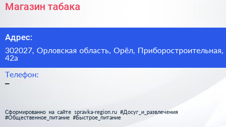 Магазин табака по адресу 302027, Орловская область, Орёл, Приборостроительная, 42а в дальнейшем Организация, размещена в следующих категориях: