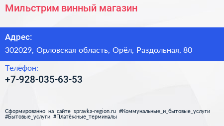 Мильстрим, винный магазин по адресу 302029, Орловская область, Орёл, Раздольная, 80 в дальнейшем Организация, размещена в следующих категориях: