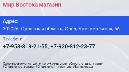 Мир Востока, магазин по адресу 302026, Орловская область, Орёл, Комсомольская, 66 в дальнейшем Организация, размещена в следующих категориях: