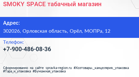 SMOKY SPACE, табачный магазин по адресу 302026, Орловская область, Орёл, МОПРа, 12 в дальнейшем Организация, размещена в следующих категориях: