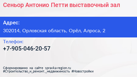 Сеньор Антонио Петти, выставочный зал по адресу 302014, Орловская область, Орёл, Алроса, 2 в дальнейшем Организация, размещена в следующих категориях: