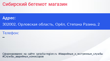 Сибирский бегемот, магазин по адресу 302002, Орловская область, Орёл, Степана Разина, 2 в дальнейшем Организация, размещена в следующих категориях: