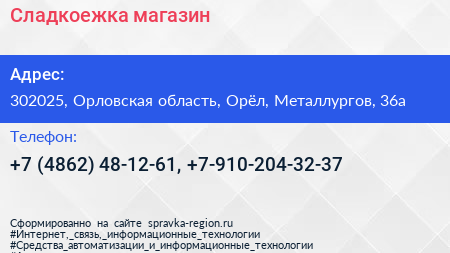 Сладкоежка, магазин по адресу 302025, Орловская область, Орёл, Металлургов, 36а в дальнейшем Организация, размещена в следующих категориях: